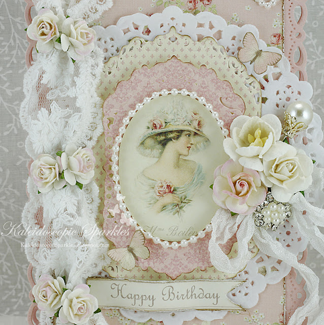 I also adore the decor in the first frame, which inspired my lace design along the side. Darling two-tone roses (and hidden Prima vax cord) encourage sweet 'poofs' of Coco lace. Do you like my technical wording? :o) Inspired by the bride, I chose my favorite vintage lady from the collection to serve as my birthday girl. She is surrounded with pearl string and nestled within Spellbinders Gold Labels Four layers.