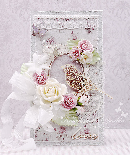 13. Love this garden inspired card, with the lovely papers, that gorgeous frame and delicate bird! Your laces pearls and blossoms are all such wonderful embellishments arranged so perfectly! Another stunner, and most inspiring! Sending more hugs!