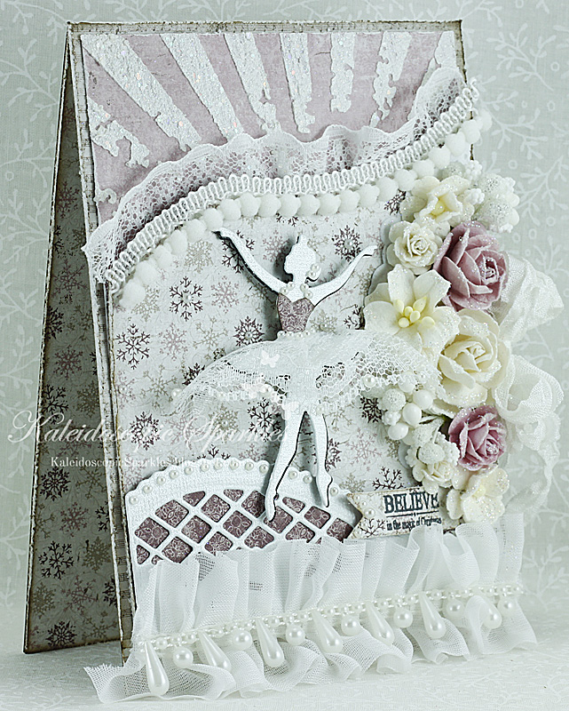 My love for trims encouraged a snowy horizon of lace that opens to the heavens and tiny poms that release dainty snowflakes below. The sunset is lavender is honor of our Sugar Plum Fairy ballerina, who is dancing upon a pearly snowdrift into sweet Christmas dreams. Their precious girl, who changed us all forever with her bravery and love, is encouraging her parents to keep their gaze upward and to guard their beautiful hearts. She is lifting their strongholds and releasing healing light. The ballerina is a Marianne Design die, which is embellished with a lacy tutu and pearl adornments. The snowdrift is Marianne Design's Fancy Edge, nestled within my favorite shabby ruffle trim.