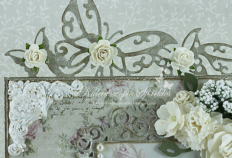 The gorgeous rose image is from Sagen's Mix sheet. The delicacy is one of my favorite aspects of it. It is atop a Joy! Crafts Frame and Three Corners die. Detailing the bottom of my card are a few of Sandy's cream-colored goodies: Maya Road Tulle Pleat Trim, Valerie Lace, and Flatback Pearl String. The lovely butterfly border is a Die-Versions Whispers die. It is trimmed with a Cheery Lynn Anastasia border.
