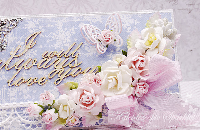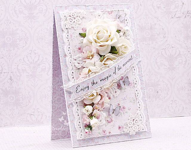 I combined pink and white blossoms, which sparkle with a touch of Glamour Dust paint. A vintage crown pin (on special!) is nestled within. The dreamy papers are from Maja Design's Sofiero collection.♥︎